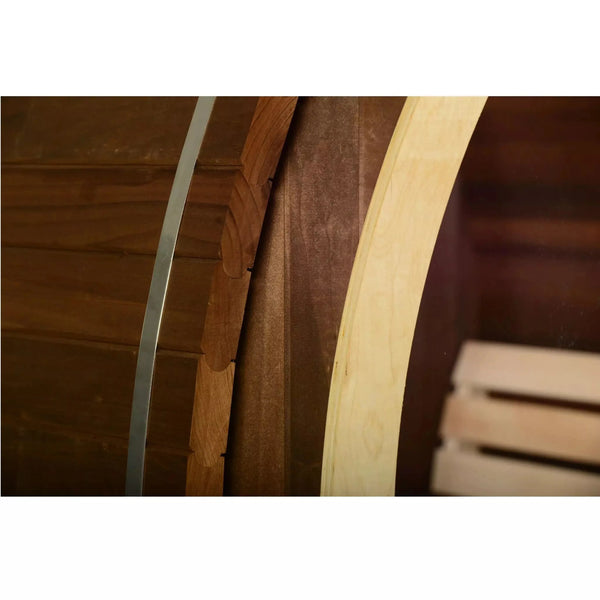 Choose luxury and innovation with the Phoenix Barrel Sauna—a beautifully designed outdoor sauna that comfortably fits up to six people. Crafted from thermally modified Hemlock, this sauna offers long-lasting durability and rich, elegant wood tones. The Phoenix combines modern aesthetics with traditional sauna elements, featuring floating benches, a blended door handle, and perfectly cut tempered glass windows that invite light while maintaining privacy and ambiance.