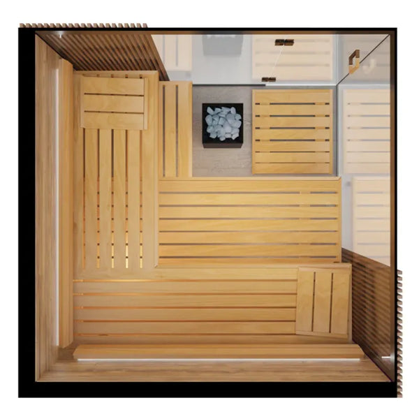 Aalto brings Scandinavian luxury and sculptural design into your home, blending wood and glass in a sleek, modern form. Its panoramic glass front and corner-friendly layout create an open, airy feel that integrates beautifully into contemporary spaces.