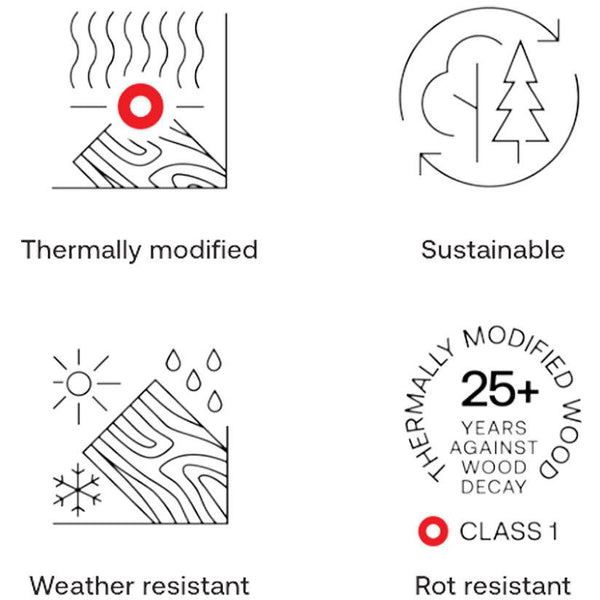 Thermal modification preserves the beauty of real wood, enhancing it naturally with only heat and steam for unequaled durability and stability—even in changing weather conditions. Plus, no hot feet!