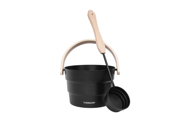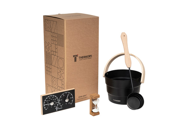 Experience true European sauna quality with the Thermory sauna bucket, ladle, thermometer / hygrometer and sand timer package. Imported exclusively from Europe, this premium package ensures optimal sauna conditions.